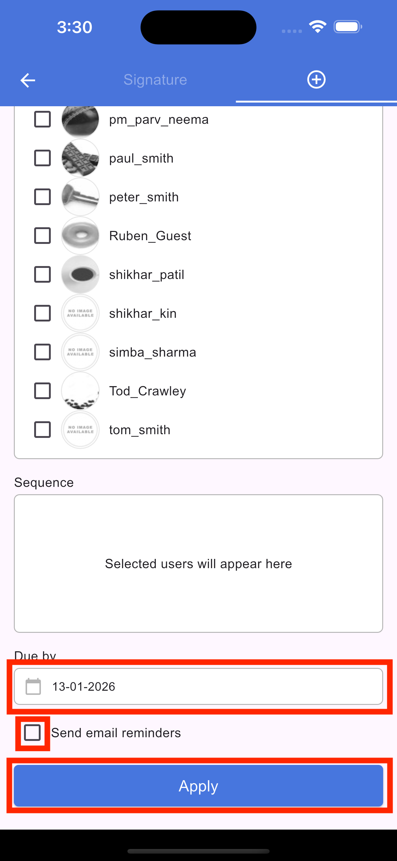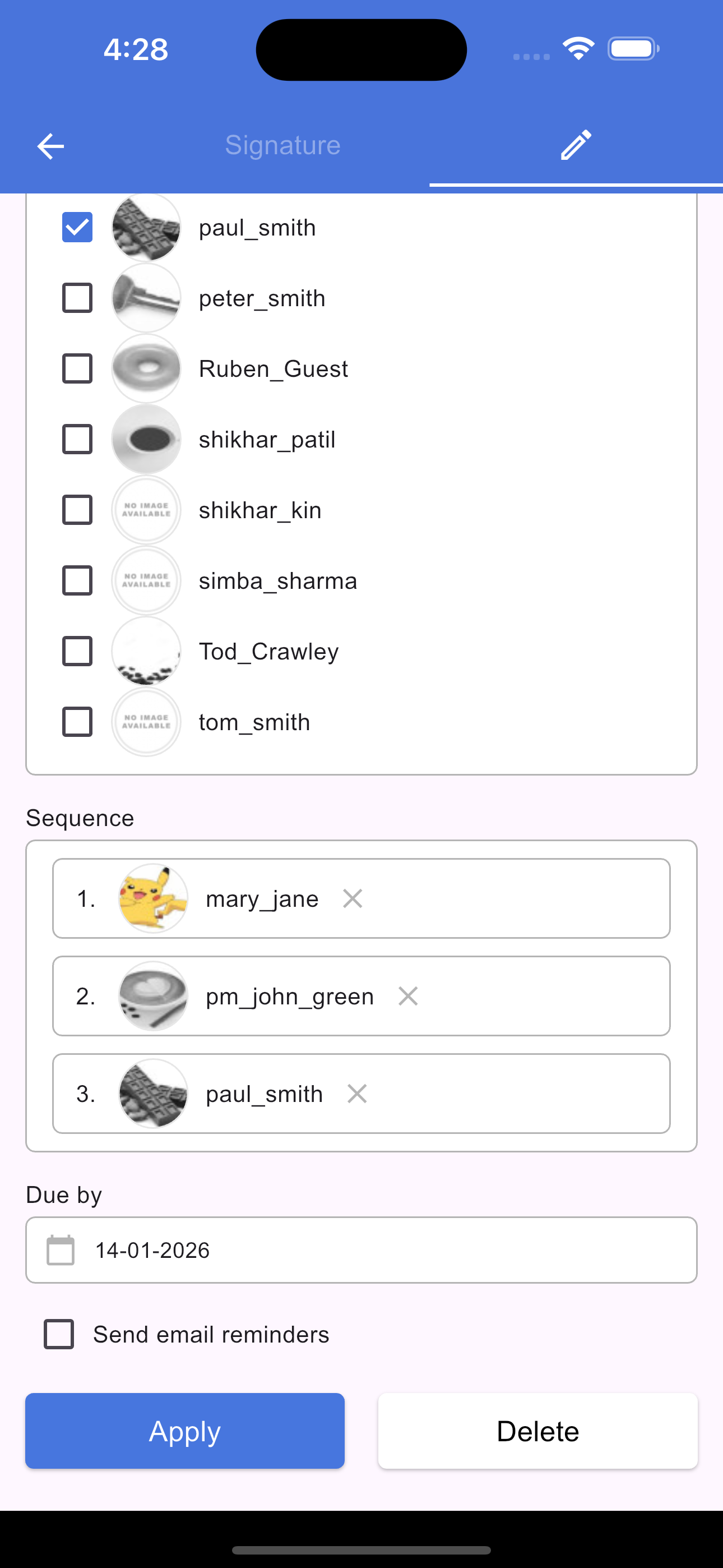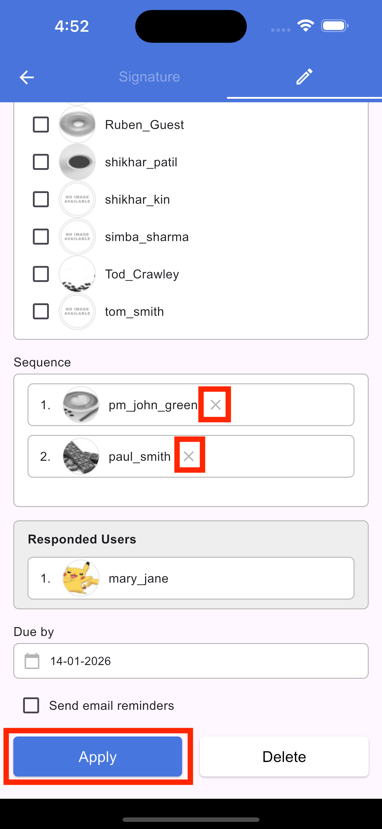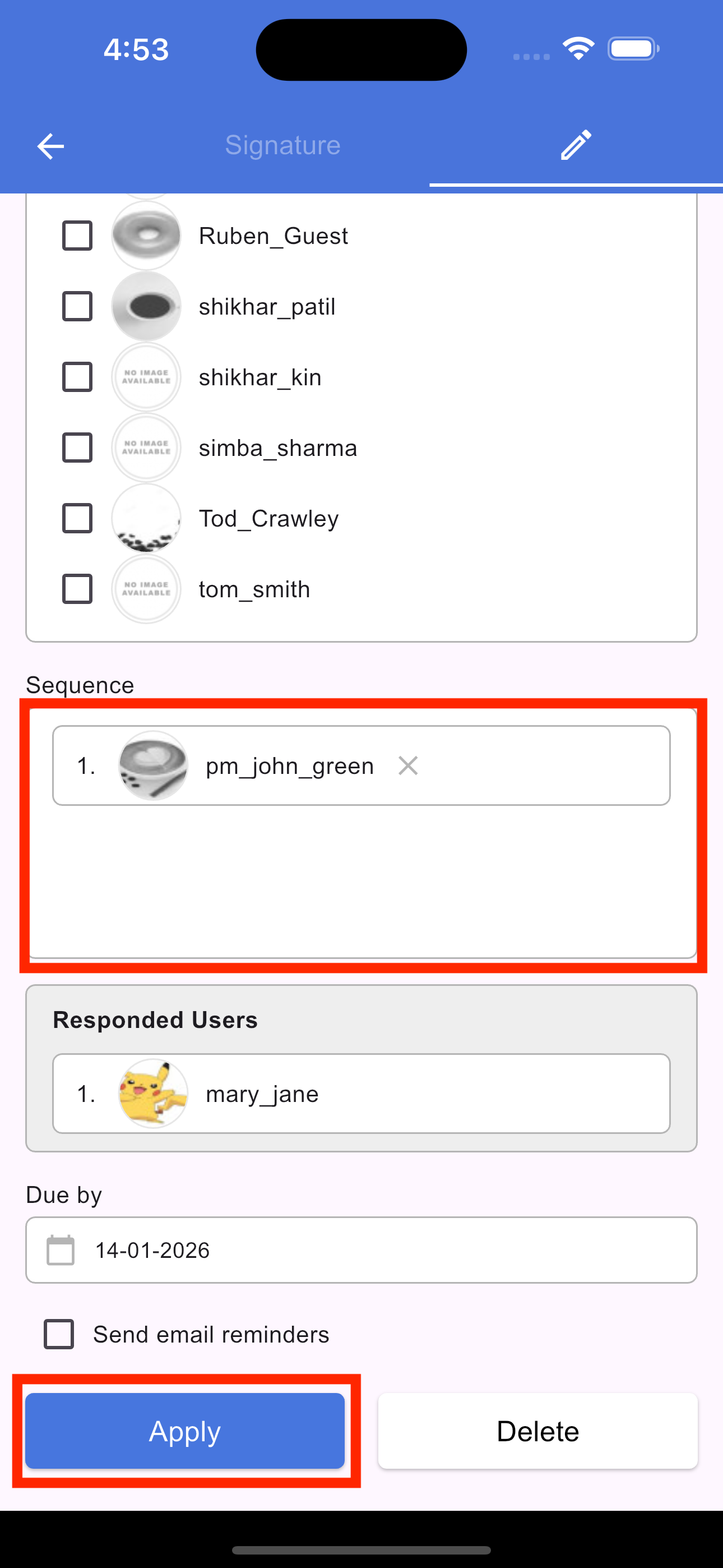 To modify an existing request, tap the Signature icon in the section footer. On the screen that opens, select the Pencil (Edit) icon. From here, you can update the due date, add new signers, or rearrange the signing sequence. Once you have made your changes, tap Apply to update the signature request and save your changes.