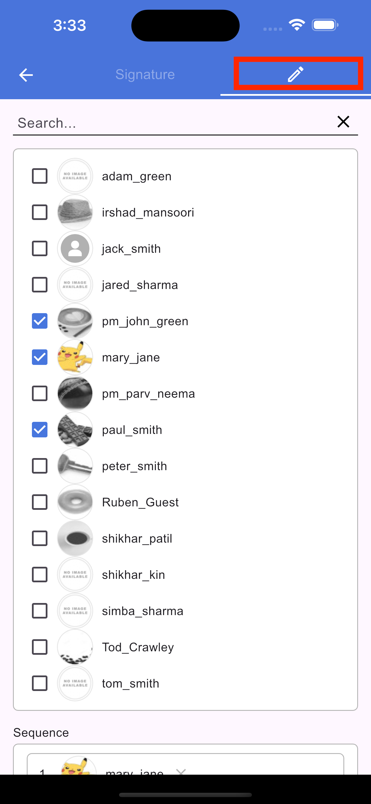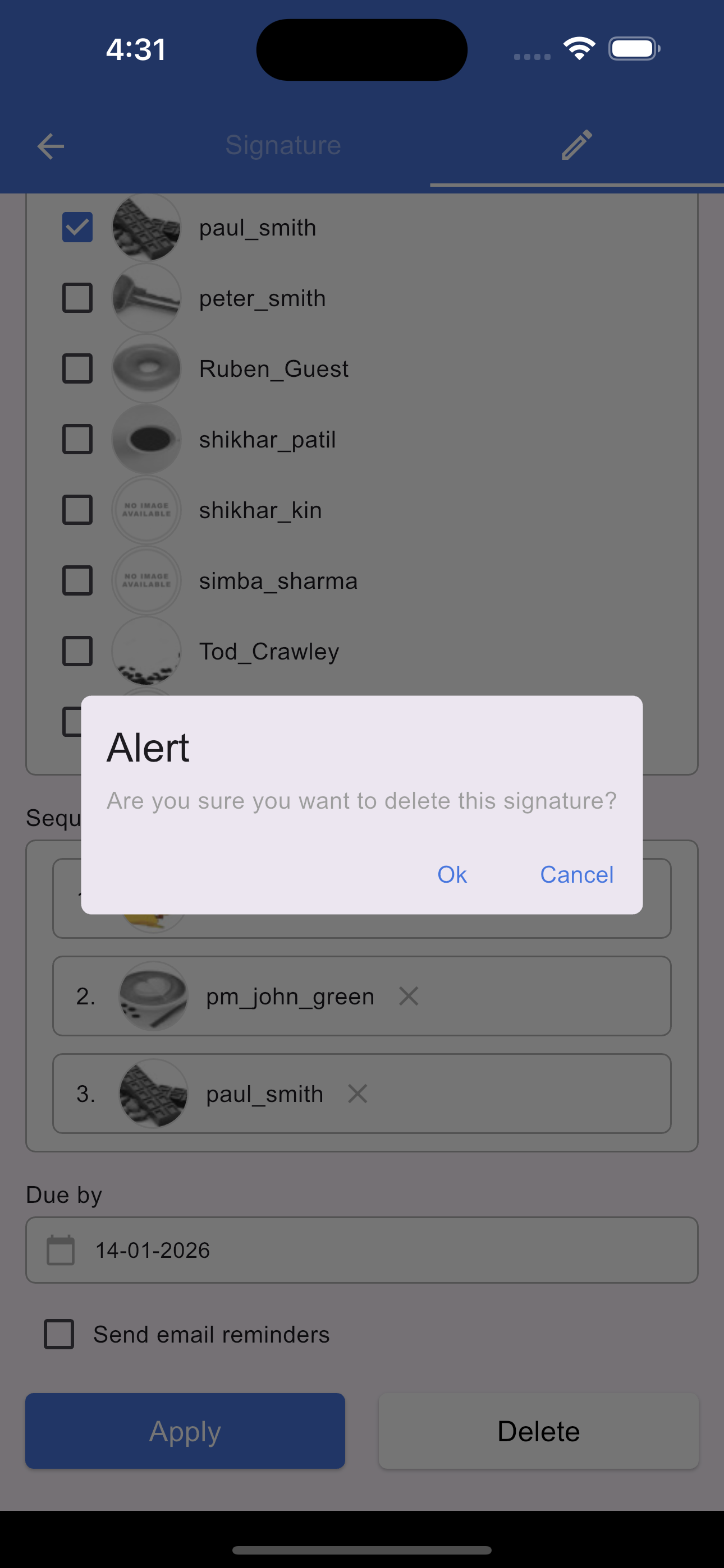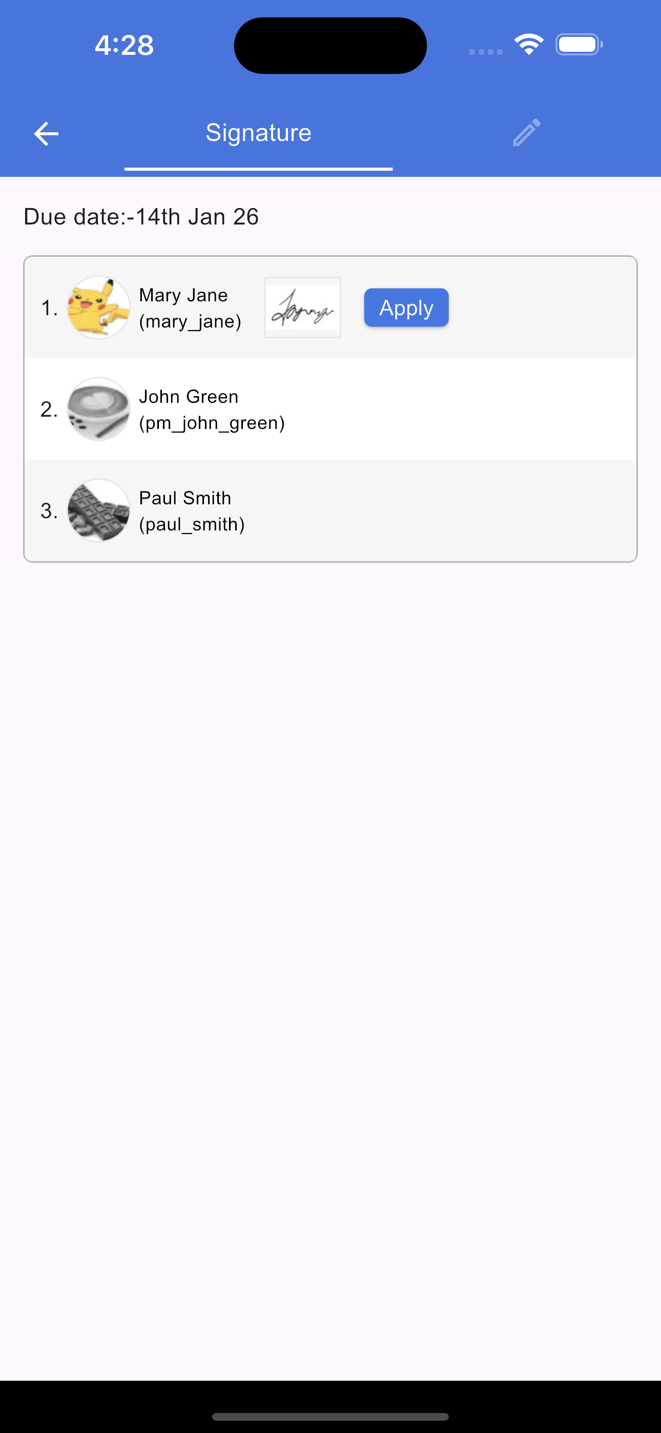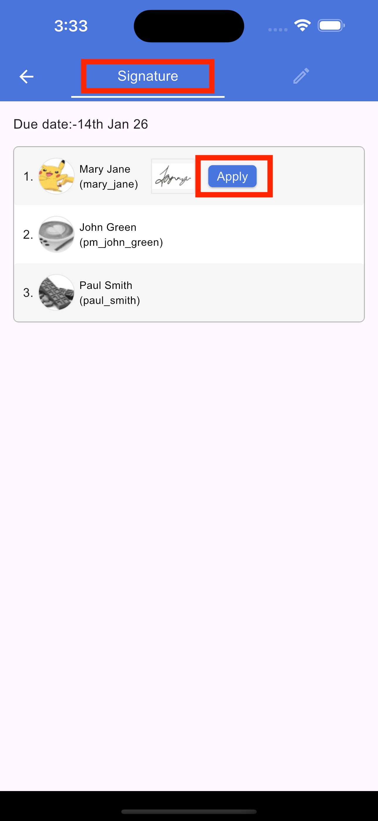 To modify an existing request, tap the Signature icon in the section footer. On the screen that opens, select the Pencil (Edit) icon. From here, you can update the due date, add new signers, or rearrange the signing sequence. Once you have made your changes, tap Apply to update the signature request and save your changes.