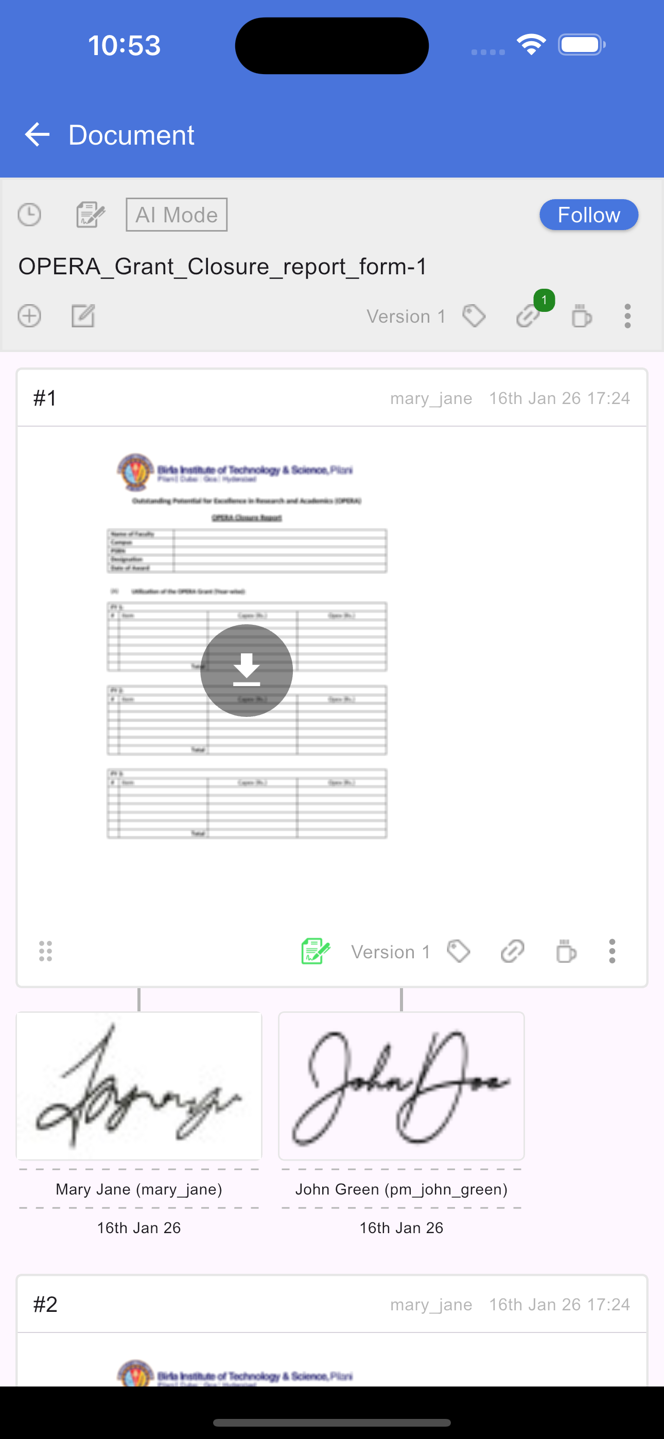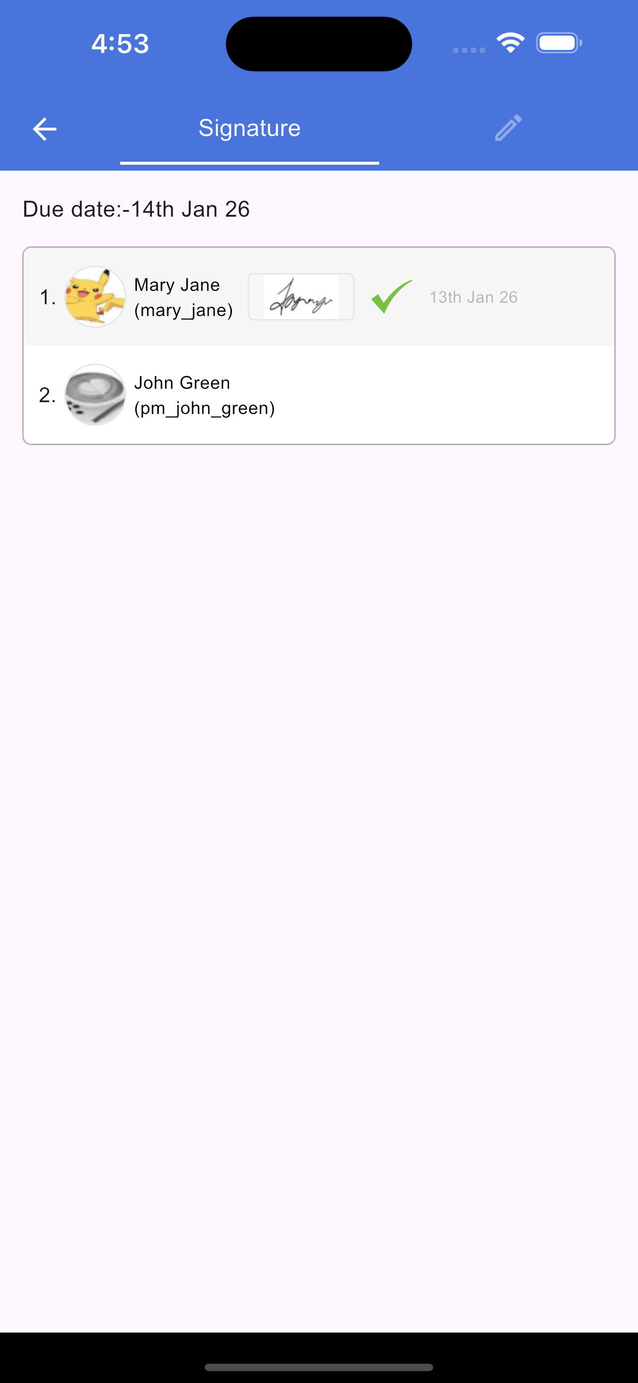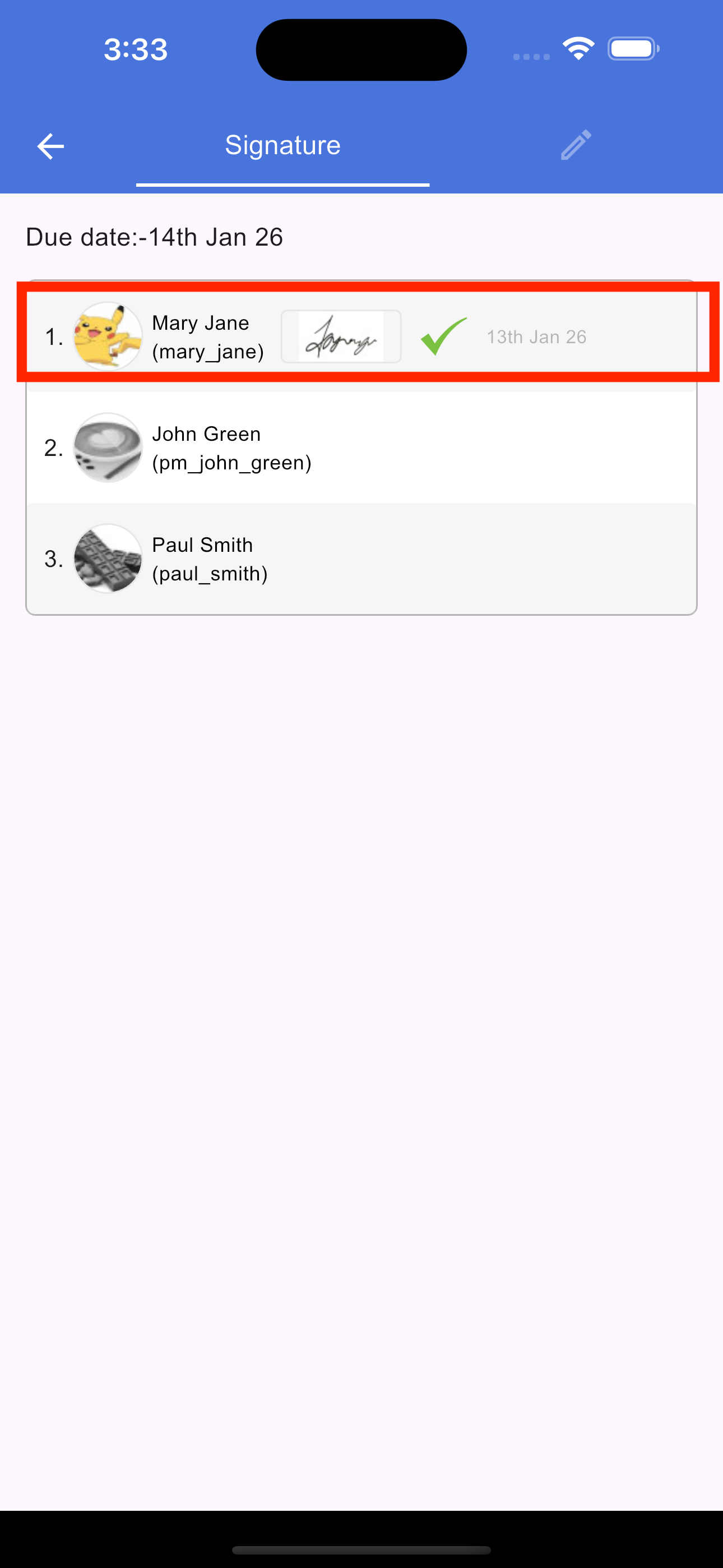 To view all signatures assigned to you, tap the Signature icon in the document header. This opens a new screen titled "Your Signatures," which displays a list of every request in the document where you are a signee. Tapping any item in this list will redirect you back to the document screen and automatically scroll to highlight the specific section that requires your signature.
