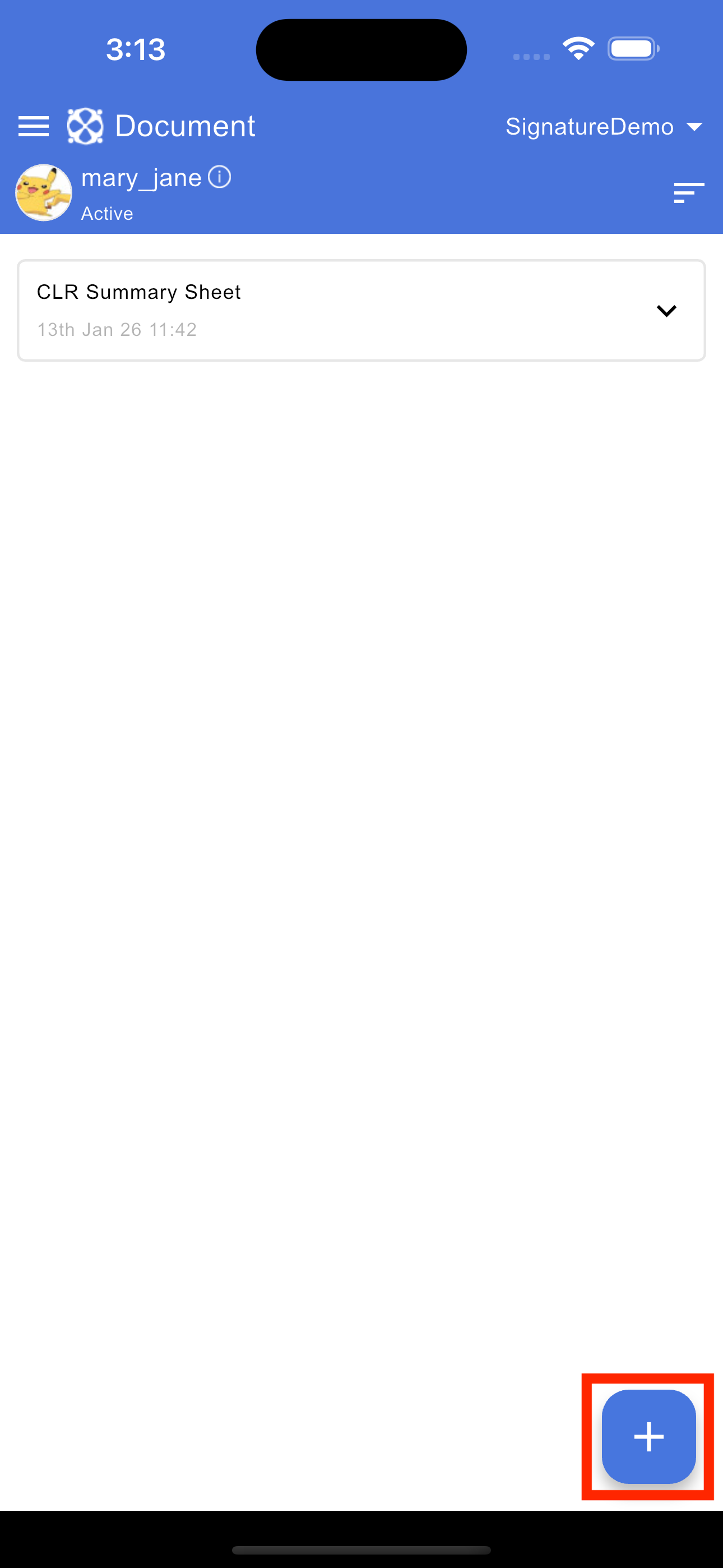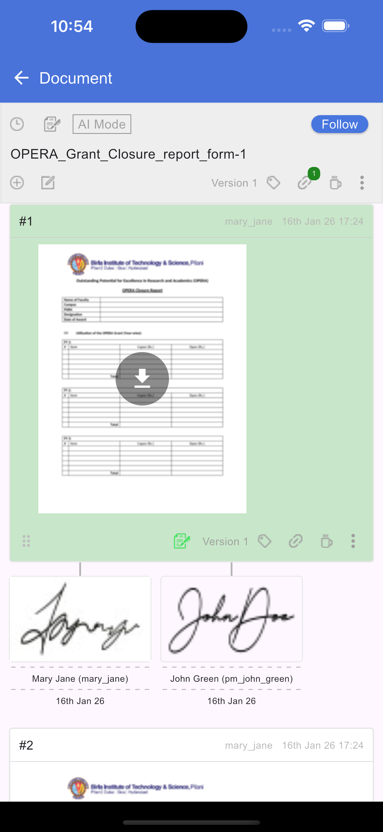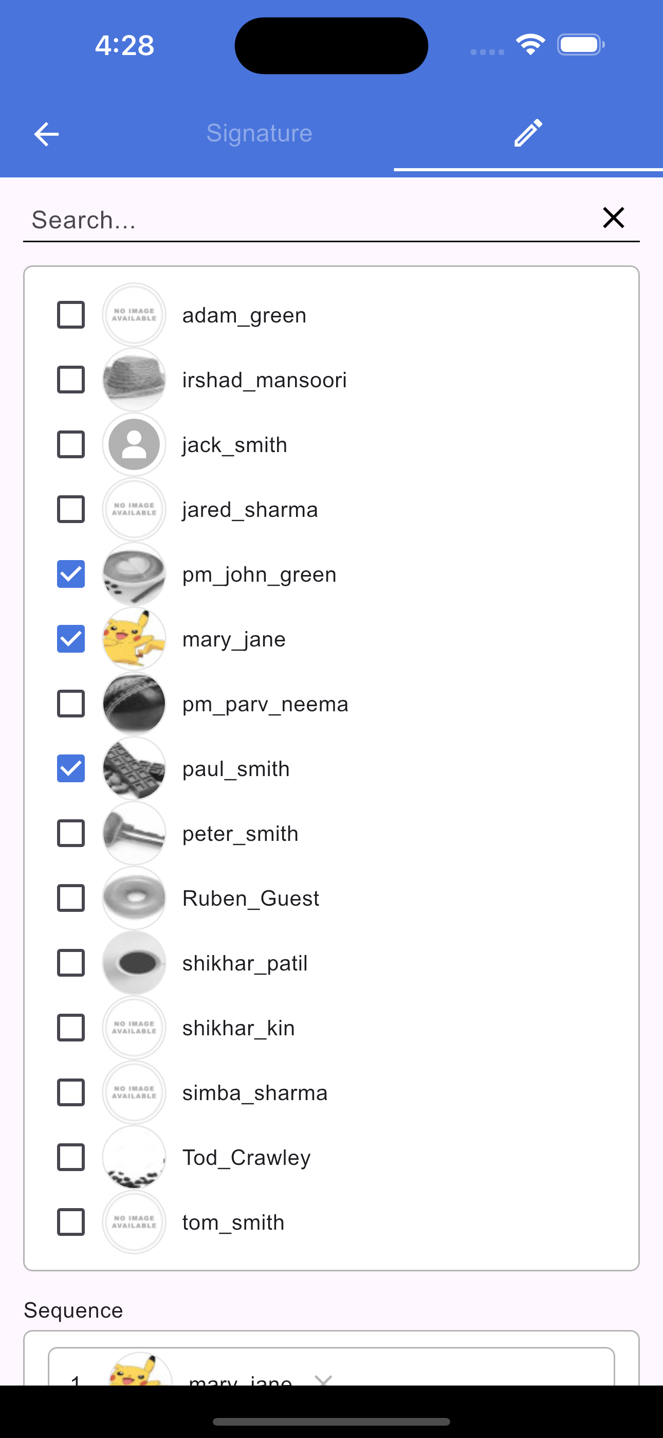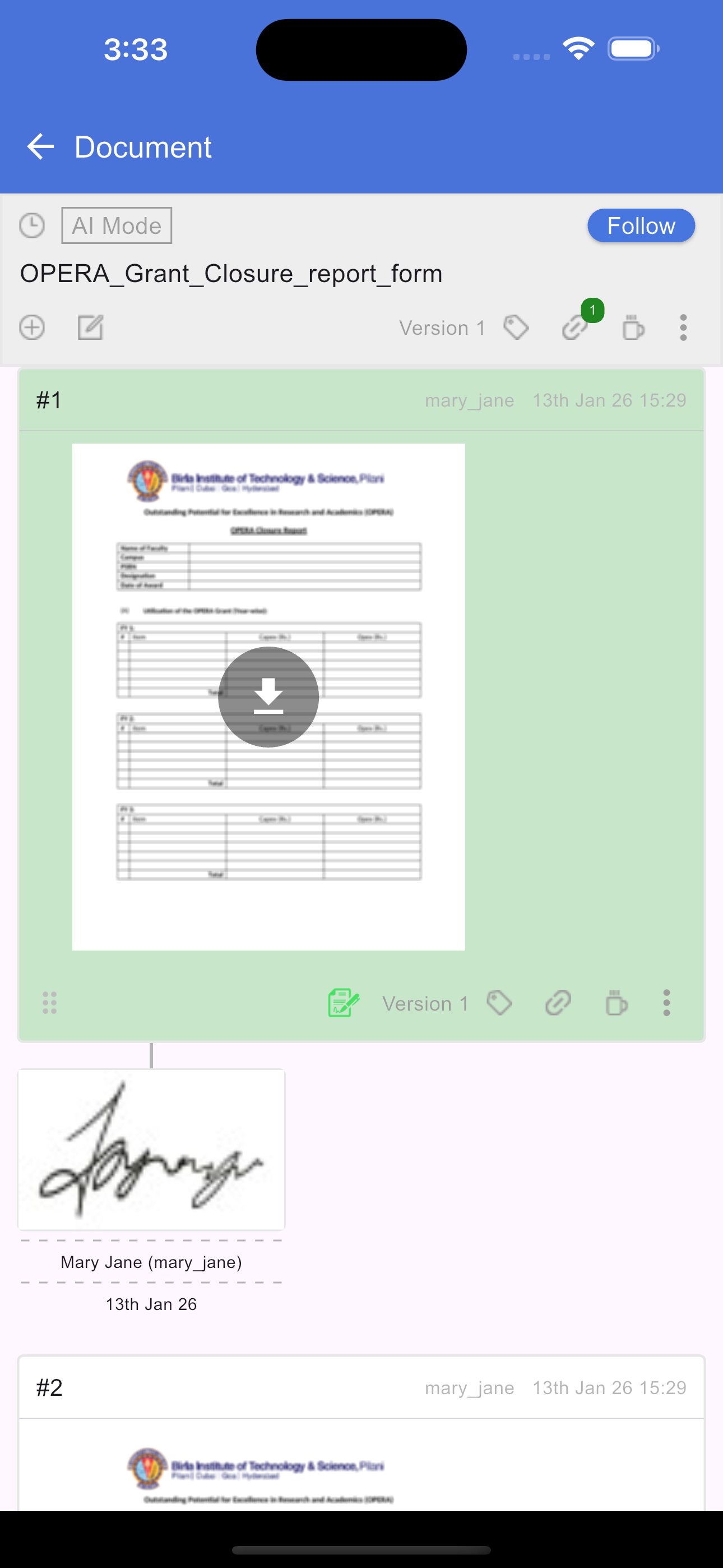 To view all signatures assigned to you, tap the Signature icon in the document header. This opens a new screen titled "Your Signatures," which displays a list of every request in the document where you are a signee. Tapping any item in this list will redirect you back to the document screen and automatically scroll to highlight the specific section that requires your signature.