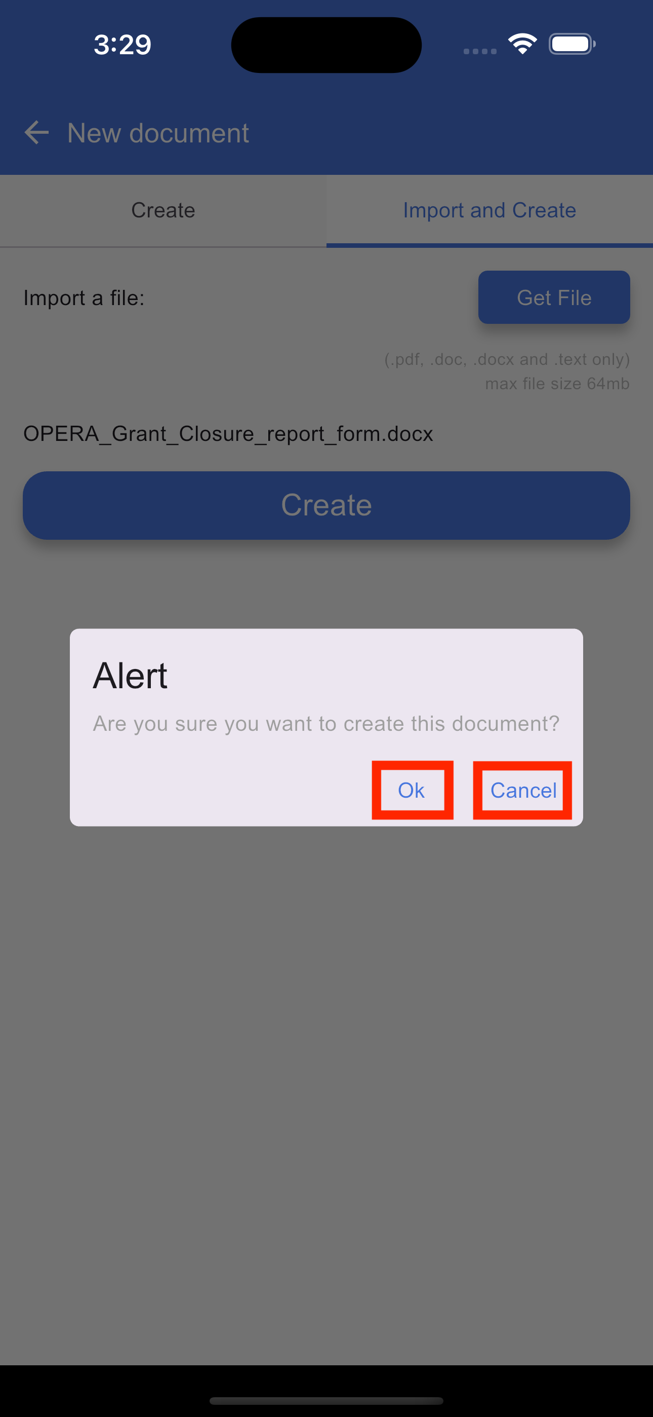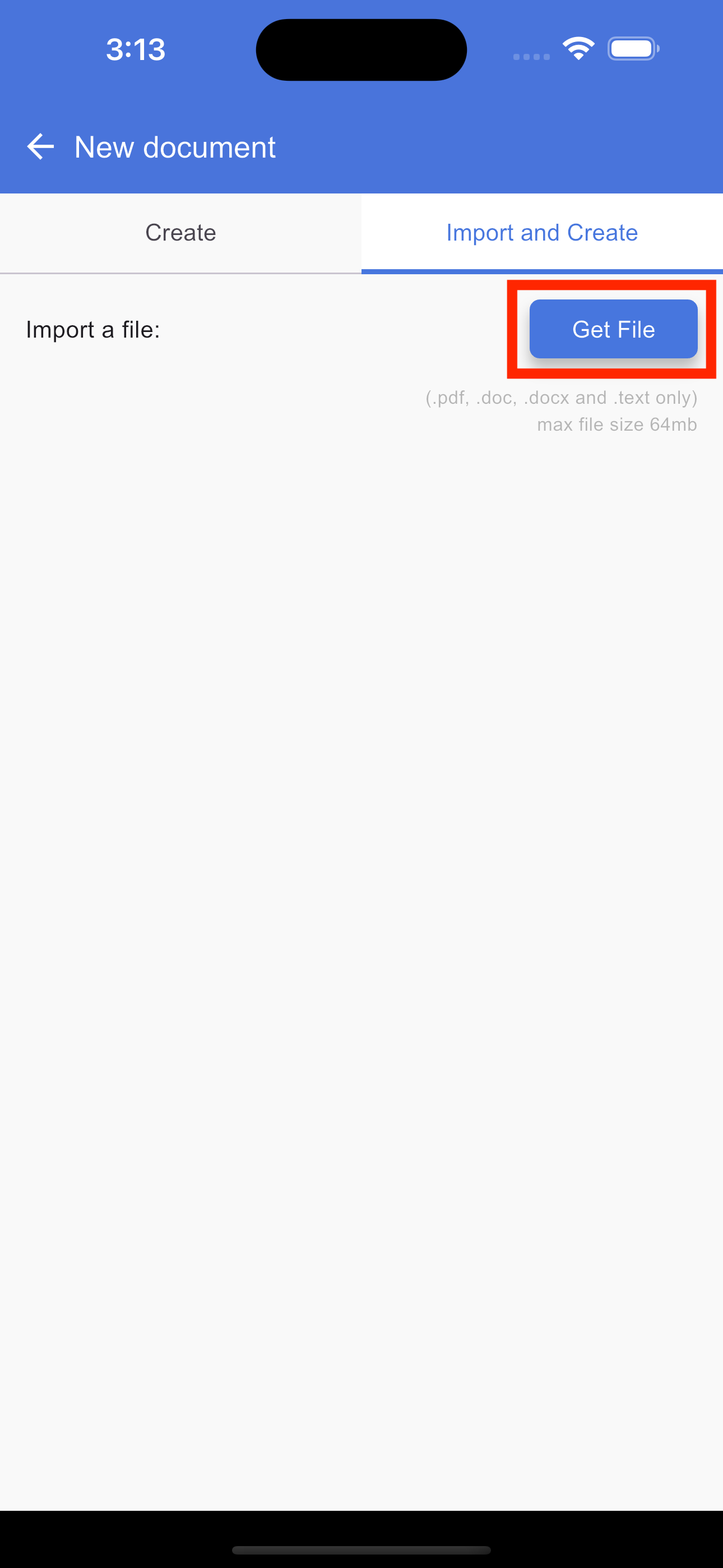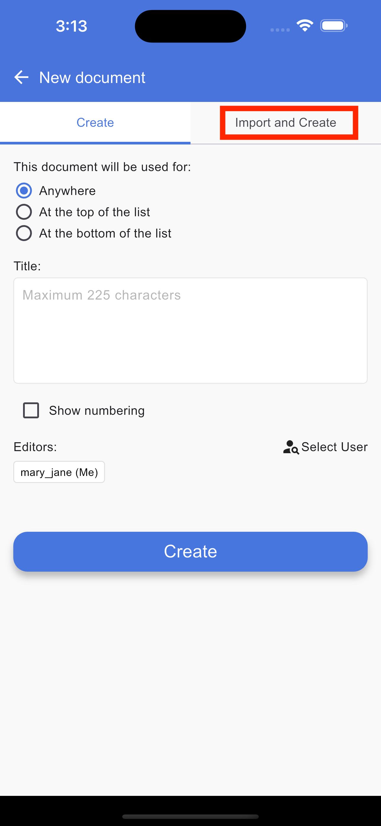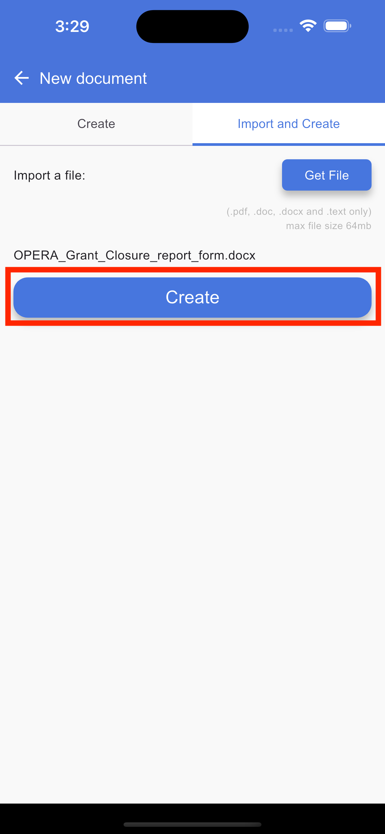 To create a new document using the import feature, open the document application to load the Home page, which serves as your document list. On this page, tap the "+" (Plus) button and select the Import and Create tab. This will open the upload screen where you can tap the Browse button to select a PDF, DOC, DOCX, or text file from your device. Once your file is uploaded, tap the Create button to generate a document from the file. After the document is successfully created, you will be automatically redirected to the document list page where your new document will appear.